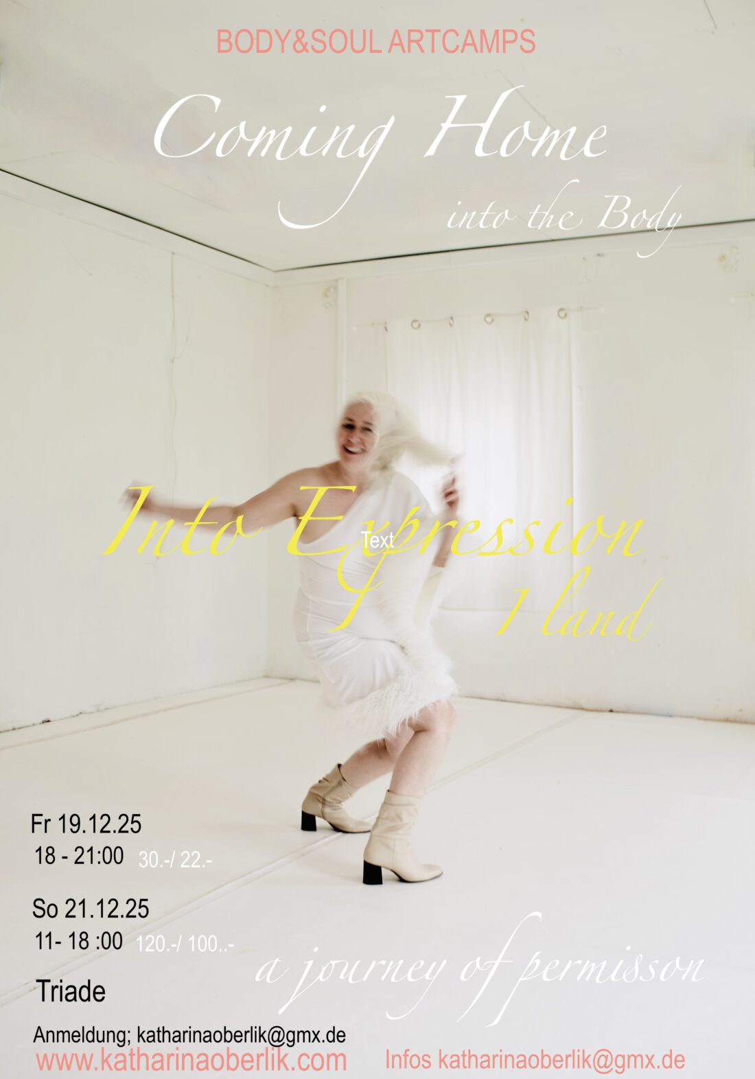COMING HOME   A Journey of permission into EXPRESSION Für die eigene Praxis zwei Angebote, um Dich zu klären, ganz bei Dir anzukommen und mit deinem Ausdruck zu spielen und zu forschen. Beide Workshops finden im Tanzstudio Triade in Hamburg, Bernstorffstrasse 117 statt   Freitag 19. Dezember 18:00-21:00 COMING HOME Into Your Body Tiefes Eintauchen